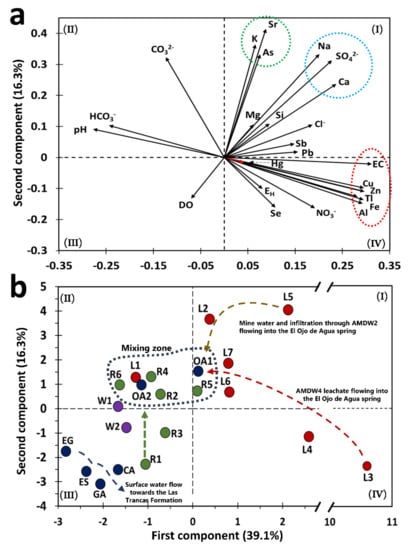 Principal component analysis for the water samples collected in the study area. (a) Eigenvector of the variables considered in the PCA. (b) Projection of the leachate samples (red circle), wells (purple circle), rivers (green circle), and springs (blue circle).