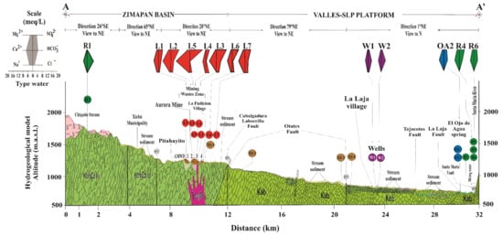 The region studied in this work is in a rugged, mountainous zone in the Sierra Gorda of Guanajuato, which has faced several challenges related to developing infrastructure that favors water accessibility. Based on a volume of 31.5 Mm3, that drains from springs annually from these sources [27], the drinking water supply for the Sierra Gorda marginalized communities can potentially be sustained. Therefore, it is important to determine the water quality and to describe the geochemical processes that control it. Hence, this work focuses on identifying the presence of As, Hg, and Tl and evaluating their impact on natural springs, well groundwater, and surface water. In addition, it is important to discern whether the presence of these elements is natural or associated with the leachates coming from the AMWDs at the now inactive mine known as La Aurora in the Xichú mining district (XMD).