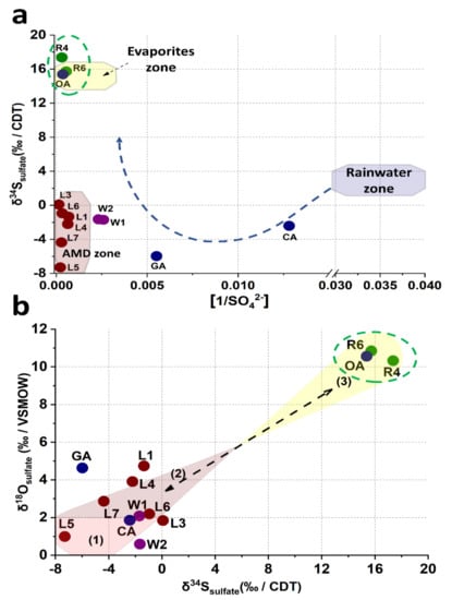 Isotopic analysis. (a) δ34Ssulfate values vs. the 1/[SO42−] ratio showing the rainwater zone and evaporite zones and defining a new zone in this study for water quality associated with AMD produced by sulfide oxidation.(b) Isotope values of δ18Osulfate and δ34Ssulfate associated with each input and output flux of sulfate. The shadow areas represent the identified processes that correspond to (1) mineral sulfide oxidation, (2) precipitation of sulfate secondary minerals by oversaturation, and (3) old Cretaceous evaporite dissolution from the El Abra Formation.