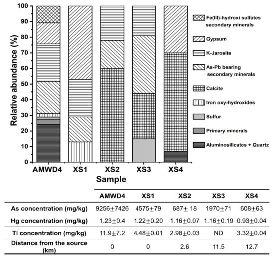 Relative abundance of mineral phases identified by XRD in the wall of AMWD4, stream sediment samples, and the corresponding As, Hg, and Tl total concentrations (mg/kg). The As–Pb-bearing secondary minerals are represented by beudantite, Pb-jarosites, Lautite, Lanarkite, Segnetite, scorodite, and Sarkinite. Fe(III)-hydroxi-sulfate secondary minerals correspond to ferricopiapite and coquimbite. Iron oxides correspond to goethite and lepidocrocite. Primary minerals correspond to pyrite and chalcocite (see Table 3).