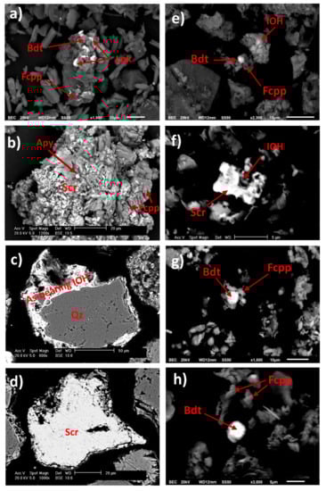 Photomicrographs of particles present on the wall of AMWD4 (a) and (b); stream sediments XS1 (c) and (d), XS2 (e), XS3 (f) and (g), and XS4 (h). SEM-EDS point analysis suggests the presence of arsenopyrite (Apy), beudantite (Bdt), scorodite (Scr), As-bearing IOH, ferricopiapite (Fcpp), and lanarkite (Lnk) (see Table S5).