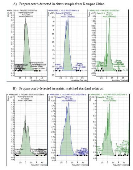 Determination of the fungicide propamocarb in the LC–MS/MS. (A) Chromatogram of fragment ions (parent and daughter) of propamocarb detected in citrus sample from Kampos, Chios. (B) Chromatogram of fragment ions (parent and daughter) of propamocarb detected in matrix-matched standard solution.