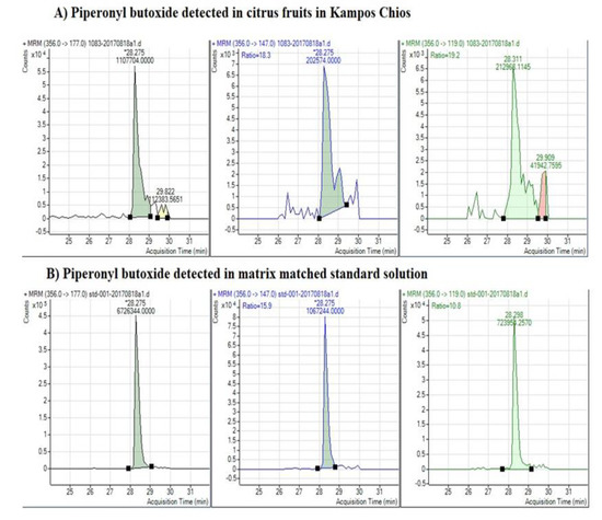 Determination of the synergist piperonyl butoxide in the LC–MS/MS. (A) Chromatogram of fragment ions (parent and daughter) of piperonyl butoxide detected in citrus samples from Kampos, Chios. (B) Chromatogram of fragment ions (parent and daughter) of piperonyl butoxide detected in matrix-matched standard solution.