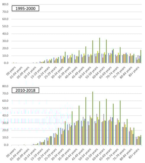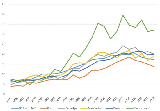 Age-adjusted thyroid cancer incidence rates were obtained from the New York State Public Access Cancer Epidemiology Data (NYSPACED) for all New York State (NYS) counties and examined for the following NYS counties (NYC boroughs) separately: New York county (Manhattan), Kings county (Brooklyn), Queens county (Queens), Bronx county (Bronx), and Richmond county (Staten Island), and for the remaining counties combined (NYS excluding NYC) []. The NYS excluding NYC region most closely resembles the demographic composition of Staten Island []. In present paper, the NYC borough names are reported. In addition to NYS county/NYC borough information, year of diagnosis, age, and summary stage were extracted from the NYSPACED data files. Age-adjusted thyroid cancer rates by county were available from 1995 to 2018 in the used NYSPACED data release. Age was grouped into 19 age groups, starting with ≤1 year old and 1 to 4 years old, followed by 5-year age groups up to 80–84 years. All patients of 85 years and older were grouped into one age group. Summary stage was grouped into in situ, local, regional, distant, or unknown following the appropriate Surveillance, Epidemiology, ad End Results Program (SEER) staging variables.