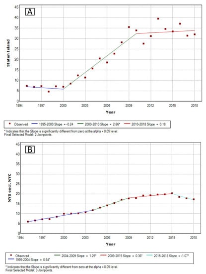 To assess changes in age-adjusted thyroid cancer incidence rates per geographic region, the method of joinpoint regression models was used to identify where different trend lines were connected at the “joinpoints” (Joinpoint Trend Analysis Software, version 4.9.0.0). The software starts with the minimum number of joinpoints and tests if more joinpoints are statistically significant, using a Monte Carlo Permutation method, and incorporating an estimated variation for each data point. The software also reports the Annual Percent Change (APC) for the trend lines. Because Staten Island most closely resembles the demographic composition of NYS excluding NYC, results of the joinpoint regression models of these two regions were reported.