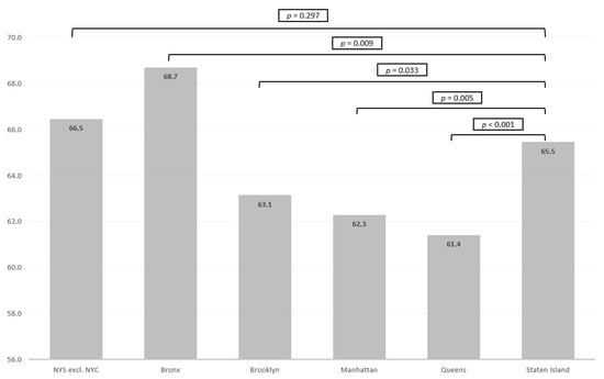 On Staten Island, 65.5% of the thyroid cancers were local stage/in situ cancers at diagnosis; the Bronx (68.7%) had a significantly higher percentage of local stage/in situ cancer compared to Staten Island (p < 0.001). There was no significant difference in percentage of local stage/in situ cancer when comparing Staten Island with NYS excluding NYC (p = 0.297). Brooklyn (63.1%), Manhattan (62.3%) and Queens (61.4%) had significantly lower percentages of local stage/in situ cancer compared to Staten Island (Figure 4).