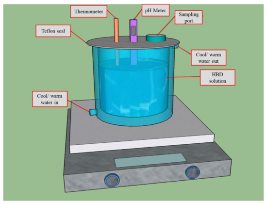 All the batch experiments for HBD degradation using ferrate (Na2FeO4) were performed (Figure 1). HBD solutions were prepared in distilled water. HBD degradation removal by Fe(VI) was investigated for the effect of pH (3.6 to 9.4), molar ratio (2 to 8), and temperature (15 °C to 55 °C). The initial pH was adjusted using a fabricated buffer solution, NaOH and sulfuric acid. The temperature was controlled using a temperature control bath. The degradation experiment was started by injecting a specific Fe(VI) dose into the reactor with stirring. At a specific time (0.5, 1, 2, 5, 10 and 20 min), a sample was taken using a water sampler, and then the sample was extracted using the liquid–liquid extraction technique with hexane.