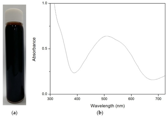 One method that can be used to analyze ferrate is using UV-Vis spectrophotometry. Fe(VI) has a typical UV-Vis absorption at a wavelength of 510 nm [23], as shown in Figure 2b. The following reaction can describe the formation of Fe(VI) [24] Equations (2) and (3):