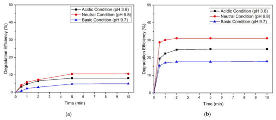 According to Figure 3, quantitatively, bromobenzene and chlorobenzene removal at a low pH (3.6) was 8.09% and 24.961%. When the initial pH solution increased from 3.6 to 6.8, the levels increased obviously from 8.09% to 10.60% and 24.961% to 31.124%, respectively. Further, an initial pH solution increase to 9.4 reduced bromobenzene and chlorobenzene removal efficiency by 4.89% and 17.950%, respectively, in 10 min of contact time. According to previous research, at a low pH (<5), ferrate is very unstable and decreases rapidly (within minutes). The decomposition rate of ferrate with water is far greater than the reaction rate of ferrates with pollutants [26], whereas at a high pH (>9), ferrate is more chemically stable and lasts longer in the experimental reactor, resulting in the reaction rate of the ferrates tending to be slow [27]. Consequently, the experimental results showed that the highest bromobenzene and chlorobenzene degradation was achieved in neutral conditions (pH 6.8).