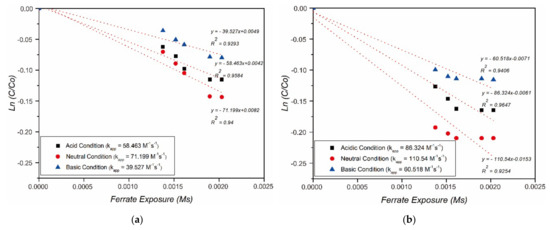 Kinetic studies in the degradation of HBD by ferrate at various pHs were also carried out. The kinetics for the ferrate(VI) reaction and other, different compounds have been investigated and are very well determined by the law of second-order reaction rates [28,29,30,31,32]. Second-order reaction rate law following (Equation (4)) is rearranged and is integrated to become (Equation (5)):