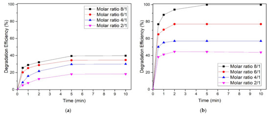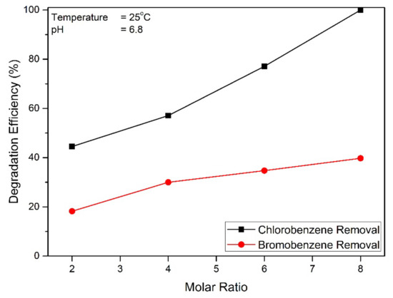 Increasing the molar ratio will significantly affect the degradation efficiency [34]. As shown in Figure 6, increasing the molar ratio from 2 to 8, the corresponding percent degradation efficiency decreases from 18 to 39% for bromobenzene degradation and increases from 44.53 to 100% for chlorobenzene degradation within a 10 min reaction time. The highest removal fraction of bromobenzene and chlorobenzene was approximately 44.530% and 100%, respectively, showing that ferrate effectively removed bromobenzene and chlorobenzene from water. It is interesting to note in this experiment that the pollutant degradation efficiency by ferrate increased with increasing molar ratio. Several reports for other pollutants indicate similar findings [13,35]. High degradation efficiency due to ferrate by-products can lead to the formation of Fe(III), which has abilities as a natural coagulant against pollutants. [36,37].