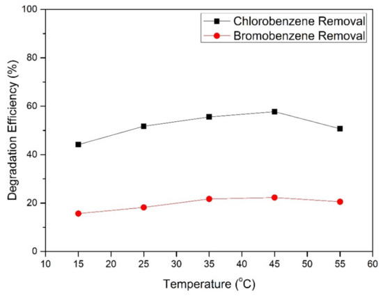 Temperature is one of the critical parameters in the process of pollutant degradation using ferrate [27]. Temperature is a vital factor because it affects the stability of the ferrate performance; therefore, experiments were carried out at five different temperatures in degrading HBD. The influence of temperature on the reactivity of Fe(VI) with HBD degradation is shown in Figure 7. The degradation percentage of bromobenzene increased from 17.23 to 22.3%, and the degradation percentage of chlorobenzene increased significantly from 44.137 to 57.75% as temperature increased from 15 to 45 °C. It then decreased at temperatures above 45 °C, with a degradation efficiency of 20.12% for bromobenzene and 44.777% for chlorobenzene degradation. The optimal temperature condition in this study for the removal of HBD was observed at 45 °C. The experimental results make sense as reactants can only react when they are in contact, and molecules move faster and collide more frequently at higher temperatures (45 °C). However, at temperatures higher than 45 °C (for example, 55 °C), ferrates tend to be unstable. Other researchers have also confirmed these phenomena that the ferrate concentration decreases with an increase in temperature above 50 °C [41].