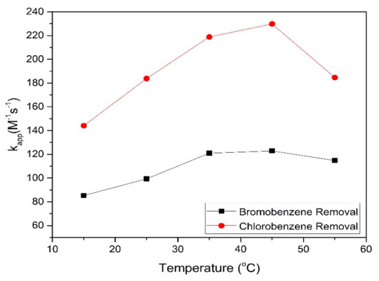 In general, temperature is very influential in the aqueous decomposition rate of ferrate [42]. As shown in Figure 8, the highest kapp values were observed at 45 °C. The Arrhenius equation (Equation (9)) is used to determine the activation energy, and the activation energy value was found to be 81.6 KJ/mol for bromobenzene degradation and 80.540 KJ/mol for chlorobenzene degradation.