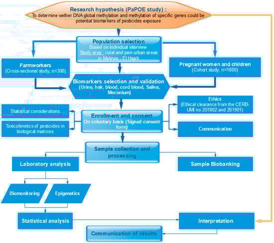 Given the above-described situation, the Parental Pesticides and Offspring Epigenome study (PaPOE) was initiated to advance the development of more effective screening methods of pesticides exposure, which form the basis for the future development of standardized prevention and treatment programs. To date, there have been few attempts at establishing longitudinal cohorts in Morocco. Our current study, the PaPOE study, is the first dedicated occupational and longitudinal birth cohort study on pesticides exposure in low-/middle-income countries. It was established to allow for the investigation of factors contributing to epigenetic variation in humans with a link to pesticides exposure. Launched in March 2018, PaPOE was designed as a prospective cohort study to investigate whether pesticides exposure could affect epigenetic changes and increase cancer risk. We will be observing how programming can have long-term consequences for later health outcomes through epigenetic mechanisms, establishing a link between parental pesticides exposure, trans-generational effects, and the health risks for offspring.