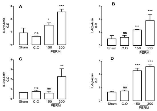 mRNA expression for IL-6 in the cerebellum (A), cerebral cortex (B), cerebral hemispheres (C) and medulla (D) in rats treated with corn oil (control group), permethrin 150 mg/kg or 300 mg/kg and rats without treatment (sham group). Values are mean ± SD (n = 4 for each group). The results were analyzed with ANOVAs followed by Bonferroni’s multiple comparisons tests to compare permethrin (150 or 300 mg/kg) groups versus the control group (sham). Data from 6 independent experiments run in quadruplicate. Without statistically different is showed as ns. * p < 0.05 vs. sham group, ** p < 0.001 vs. sham group; and *** p < 0.0001 vs. sham group; CO (Corn oil); PERM (permethrin).