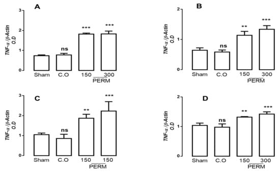 mRNA expression for TNFα in the cerebellum (A), cerebral cortex (B), cerebral hemispheres (C) and medulla (D) in rats treated with corn oil (control group), permethrin 150 mg/kg or 300 mg/kg and rats without treatment (sham group). Values are mean ± SD (n = 4 for each group). The results were analyzed with ANOVAs followed by Bonferroni’s post-hoc tests to compare permethrin (150 or 300 mg/kg) groups versus the control group (corn oil). Mean ± SD of 6 independent experiment run in quadruplicate. Without statistically different is showed as ns. ** p < 0.001 vs. sham group; and *** p < 0.0001 vs. sham group; CO (Corn oil); PERM (permethrin).