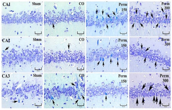 Photomicrographs of the hippocampal CA1, CA2 and CA3 of sham rats, rats treated with corn oil (CO) and rats treated with 150 and 300 mg/kg of permethrin. Arrows indicate neurons with histopathological features of cell degeneration or death. Klüver-Barrera stain.