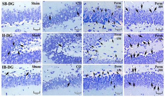The previous data showed an effect on the brain, even using the low dose of permethrin (150 mg/kg). We explored brain damage by histopathological techniques using the lower dose employed in this study. The degenerated and/or dead neurons, identified by cell body contraction, pyknotic cones as well as nuclei with karyorrhexis and karyolysis increased in different areas of the rat hippocampus (CA1, CA2, CA3 and DG) after exposure to permethrin (150 mg/kg) (Figure 5). The cytoplasm of dead neurons showed the loss of Nissl granules (consisting of rough endoplasmic reticulum and polyribosomes), which is easily observed with the Klüver-Barrera (BK) stain. The perikaryon of degenerated or dead neurons stained turquoise blue (Figure 5 and Figure 6 black arrows). These findings correlate with HE-stained hippocampal tissue sections (data not shown). The neuropil (area between glial and neuronal cell bodies that is made up of dendrites, axons, glial cells and microvasculature) changed its tinctorial affinity. In photomicrographs of the superior lamina (SB-DG), hinge region (H-DG) and inferior lamina (IB-DG) of the dentate gyrus of the hippocampus, an increase in degenerated cells was not observed when compared with the CO group (Figure 6).