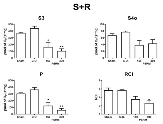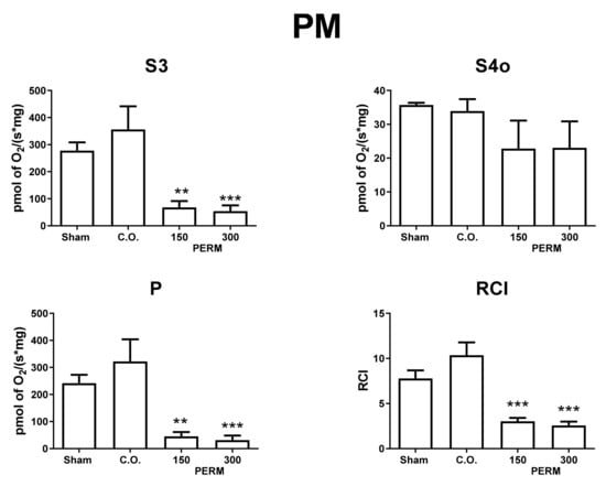 To explore if hippocampal damage due to PERM is related to alterations in mitochondrial bioenergetics, we evaluated hippocampal mitochondrial respiratory parameters in CI- and CII-linked respiration (Figure 7 and Figure 8). PERM induced mitochondrial uncoupling and reduction of oxidative phosphorylation (OXPHOS) determined by p values. PERM significantly decreased the S3 and P respiratory parameters in CI and CII-linked respiration, starting at the lower dose. However, only the higher dose significantly reduced the RCI index of CII-linked respiration. Furthermore, the reduction in respiratory parameters was notably higher for CI-linked respiration.