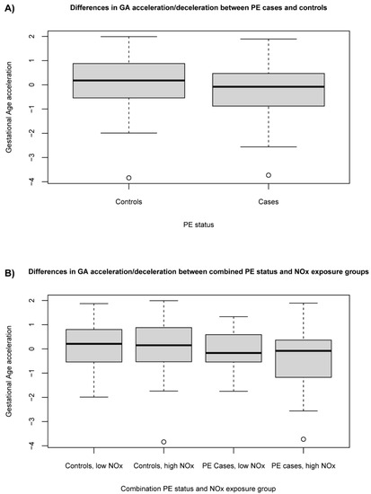 Gestational age (GA) acceleration/deceleration in (A) cases and controls and in (B) the different combinations of PE status and NOx exposure group.