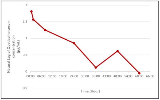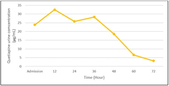 The increase in Quetiapine concentration detected between 36 and 48 h post-admission is consistent with reports in previous works [] that noted an increase in quetiapine concentration between 24 and 37 h, probably attributable to hepatic redistribution.