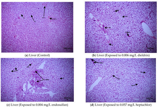 In our experiment, histology of liver of Clarias gariepinus exposed to endosulfan (0.004 mg/L), dieldrin (0.006 mg/L) and heptachlor (0.057 mg/L) revealed pyknotic nuclei with congestion of RBCs (red blood cells) in HPV (hepatic portal vein) of hepatocytes, hepatocytes fusion, vacuolization in hepatocytes, melano-macrophages canter and disintegration of hepatocytes cell membrane with oozing of cytoplasmic content. Our findings are comparable with the histological alterations of liver in Puntius conchonius [61], Oncorhynchus mykiss [60], Cichlasoma dimerus [44], Oreochromis mossambicus [45], Heteropneustes fossilis [62] exposed to endosulfan and dieldrin such as organochlorine pesticides. The present study showed that there is a strong link between liver damage and toxicants. Histological anomalies observed in fish liver tissue after acute exposure of organochlorine pesticides can cause functional disabilities resulting in malfunctioning of various organ systems [60].