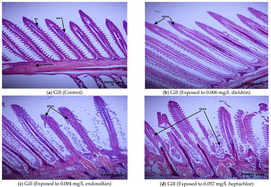 In our study, histopathology of gill of C. gariepinus exposed to endosulfan (0.004 mg/L), dieldrin (0.006 mg/L) and heptachlor (0.057 mg/L) presented thickening of primary lamellae epithelium, shorting of secondary lamellae, epithelial hyperplasia and lamellar fusion (fusion of secondary lamellae) with thickening of primary lamellar epithelium along with collapsed secondary lamellae. To validate our findings, similar histological alterations are also found in the gill of Chanos chanos [63], Oncorhynchus mykiss [60], Cichlasoma dimerus [44], Oreochromis mossambicus [64], Salmo salar [65], Channa punctatus [66] as well as Hyphessobrycon bifasciatus and Danio rerio [67] after acute exposure to endosulfan, as with other organochlorine pesticides. Exposure of fish to pollutants such as pesticides collapses gills which may disrupt gas exchange efficiency resulting in respiratory disorders, osmoregulatory dysfunction and ion-regulation imbalance to force the excretion of nitrogenous wastage products [68].