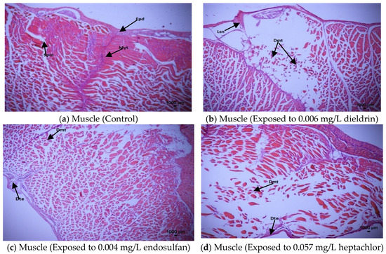 During the 96-h exposure to endosulfan, dieldrin and heptachlor, the changes in the muscle tissues of African catfish are presented in Figure 3a–d. Fishes in the control group (unexposed) revealed typical structures of muscle tissue including normal epidermis, myotomes and septum [Figure 3a] whereas seriously disintegrated myotomes, disintegrated epidermis and noticeable lesions are found in the muscle tissues after 96-h exposure of dieldrin (0.006 mg/L) [Figure 3b] and heptachlor (0.057 mg/L) [Figure 3d]. Moderate disintegration of myotomes and epidermis are observed in the muscle tissues after 96-h exposure of endosulfan (0.004 mg/L) [Figure 3c].