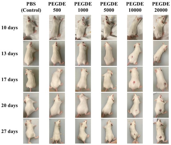 Photograph of representative mice injected with Poly(ethylene glycol) diglycidyl ether (PEGDE). Photographs of mice were taken on days 10, 13, 17, 20, 27 after PEGDE injection at a standard distance. Seven-week-old BALB/c male mice were grouped into PBS (control), PEGDE 500 μg/mouse, PEGDE 1000 μg/mouse, PEGDE 5000 μg/mouse, PEGDE 10,000 μg/mouse, and PEGDE 20,000 μg/mouse groups (n = 5 mice/group).