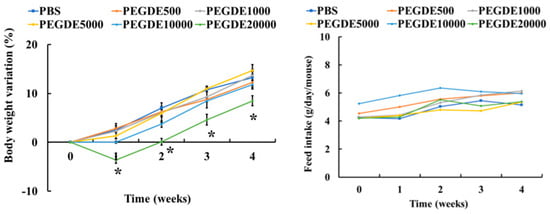 Changes in the body weight (%) and feed intake (g/day/mouse) of mice treated with Poly(ethylene glycol) diglycidyl ether (PEGDE). Body weights of mice were measured every 7 days after PEGDE injection. The feed intake in mice was measured every 7 days after PEGDE injection. Seven-week-old BALB/c male mice were grouped into PBS (control), PEGDE 500 μg/mouse, PEGDE 1000 μg/mouse, PEGDE 5000 μg/mouse, PEGDE 10,000 μg/mouse, and PEGDE 20,000 μg/mouse groups (n = 5 mice/group). * Indicates a significant difference vs. PBS control (* p < 0.05).