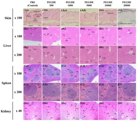 Histological analysis of mouse tissues. Skin, liver, spleen, and kidney sections were subjected to hematoxylin-eosin staining, followed by histopathological assessment by microscopy. Seven-week-old BALB/c male mice were grouped into PBS (control), PEGDE 500 μg/mouse, PEGDE 1000 μg/mouse, PEGDE 5000 μg/mouse, PEGDE 10,000 μg/mouse, and PEGDE 20,000 μg/mouse groups (n = 5 mice/group). (Aa–Ae) Histology images of skin sections at 100× magnification. (Af) Histology images of skin sections at 200× magnification. The red arrow indicates thickened epidermis, the yellow arrow indicates the detachment of keratin layer, and the orange-dotted line indicates closed wound. (Ba–Bf) Histology images of liver sections at 100× magnification. PV, portal vein; BD, bile duct; CV, central vein. (Bg–Bl) Histology images of liver sections at 200× magnification. (Ca–Cf) Histology images of spleen sections at 100x magnification. CA, central artery; MS, marginal sinus region; MZ, marginal zone; T, trabecula; RP, red pulp; WP, white pulp. (Cg–Cl) Histology images of spleen sections at 200× magnification. (Da–Df) Histology images of spleen sections at 40× magnification. C, cortex; OM, outer medulla; IM, inner medulla; RC, renal corpuscle; RP, renal papilla.