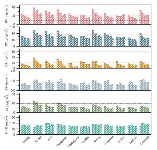 The annual average of the six criteria air pollutants in HC was displayed in Figure 1. The red dotted line represents Grade II standards, and the black dotted line represents the Grade I standards. The inter-annual variation of PM2.5 showed a downward trend but the annual average in Harbin, Jilin, Changchun, and Liaoyuan still exceeded the Grade II standard (35 µg/m3). The annual average of PM2.5 in Daqing, Mudanjiang, Qiqihar, Siping, and Songyuan had years exceeding the Grade II standard before 2017 but reached the standard after 2018. It is worth mentioning that the annual average concentration of PM2.5 in Yanbian is lower than the standard in all years. However, the annual average concentration of PM2.5 in Suihua remained stable, but slightly exceeded the Grade II standard in 2019 (37.03 µg/m3) and 2020 (41.57 µg/m3). The inter-annual variation trend of PM10 is similar to PM2.5. The annual average concentration of PM10 in Daqing, Qiqihar, Suihua, and Yanbian was lower than the Grade II standard (70 µg/m3) in all years. Harbin, Changchun, Jilin, and Siping reached the Grade II standard after 2018. The annual average concentration of PM10 in Songyuan and Liaoyuan exceeded the standard only in 2015. The annual average of SO2 in all cities reached the Grade II standard (60 µg/m3) from 2015 to 2020. Only provincial capitals (Harbin and Changchun) failed to reach the Grade II standard (40 µg/m3) for NO2 before 2017. According to the comparison between the average annual concentration of pollutants and the Grade II standards, PM2.5 and PM10 are the main air pollutants in HC. It should be noted that SO2 and NO2 declined during the COVID-19 lockdown period compared to other years according to the Figures S1 and S2. These results are similar to the results of Kazuyuki. (2021) [], which showed about 20% of NOx reduction was estimated in January and February 2020 for the whole of China using the global data assimilation.