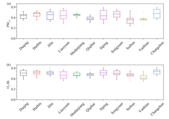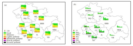 The proportion of the major pollutants during non-attainment periods in the 11 cities of HC is shown in Figure S3. The proportion of the days with PM2.5 as the major pollutant exceeded 50% in all cities. The proportion of PM10 as the major pollutant was higher in the western cities (Siping, Songyuan, and Daqing) than in other cities of HC. O3 was also one of the major pollutants but CO, NO2, and SO2 as the major pollutants rarely appeared in HC. In terms of the proportion of the major pollutants, the main pollutant in HC was PM2.5.