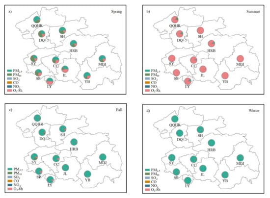 The proportion of the major pollutants in different seasons during non-attainment periods is shown in Figure 3a–d. In spring (From 1 March to 31 May), the proportion of PM2.5 as the major pollutant was usually the highest, which was displayed in Figure 3a. In Siping, Songyuan, and Daqing, the proportion of PM10 as the major pollutant was higher than in other cities. Based on our previous research [], this may be influenced by the dust weather from Inner Mongolia, especially in spring. O3 was also one of the major pollutants in spring. The formation of O3 is influenced by precursor concentrations such as VOCs and photochemical reactions [,]. The photochemical reactions in spring and summer (From 1 June to 31 August) are usually higher than those in autumn and winter, which is the reason why the high proportion of O3 as the major pollutant often occurs in spring and summer. As shown in Figure 3b, the major pollutant in summer was O3. According to Figure 3c,d, the main pollutant in fall (From 1 September to 30 November) and winter (From 1 December to 28/29 February) was particulate matter, especially PM2.5.