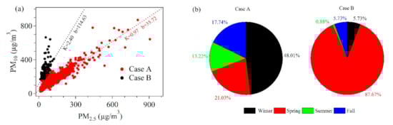 The scatter plots of the PM10 and PM2.5 was displayed in (a). Case B was divided under the condition that PM10 did not meet the daily Grade II standard (150 µg/m3) and the ratio of PM10/PM2.5 was greater than 2.7. The remaining part is Case A. (b) The pie charts show the percentages of the two Cases in different seasons.
