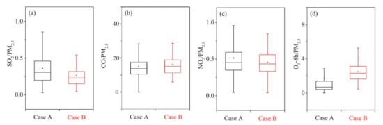 The ratio characteristics of air pollutants between Case A and B. (a) SO2/PM2.5, (b) CO/PM2.5, (c) NO2/PM2.5, and (d) O3/PM2.5.