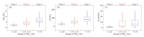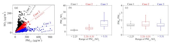 (a) The scatter plots of the PM2.5 and SO2. Case1, Case2, and Case3 represent PM2.5/SO2 ratios ranging from <2.25, 2.25–5.31, and >5.31, respectively. (b) The PM10/SO2 ratio of Case 1, Case 2, and Case 3. (c) The PM10/PM2.5 ratio of Case 1, Case 2, and Case 3.