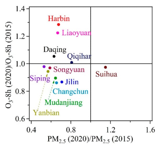 A quadrant graph is made by taking the ratio of PM2.5 in 2020 to PM2.5 in 2015 as the X-axis and the ratio of O3 in 2020 to O3 in 2015 as the Y-axis, which is displayed in Figure 9. Yanbian, Changchun, Jilin, Mudanjiang, Songyuan, and Siping showed a double downward trend in PM2.5 and O3. PM2.5 in Harbin, Liaoyuan, Daqing, and Qiqihar shows a downward trend while O3 shows an upward trend. Therefore, these cities should be paid more attention to the coordinated control of PM2.5 and O3. In Suihua, O3 shows a downward trend, but PM2.5 shows an upward trend. The city still needs to give priority to controlling the growth of PM2.5.