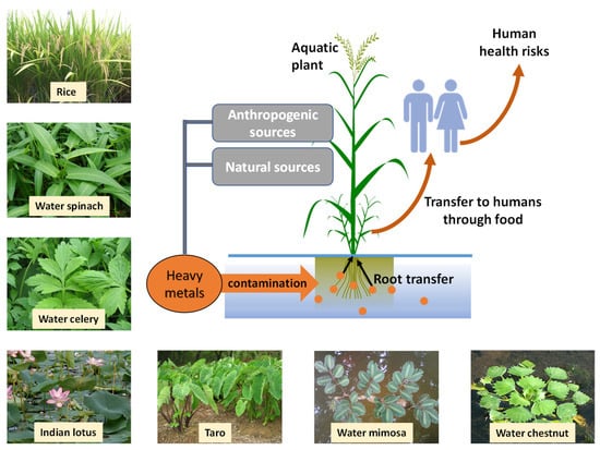 Rice and an array of aquatic plants such as water chestnut (Trapa spp.), water spinach (Ipomoea aquatica), watercress (Nasturtium officinale), taro (Colocasia esculenta), and lotus (Nelumbo nucifera) are important sources of food, particularly in many Asian countries as well as in West and Central African regions []. These plants accumulate heavy metals causing various issues to human health, the environment, and ecosystems [,].
