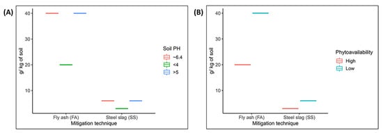 Status of (A) soil pH and (B) phytoavailability when fly ash (FA) and steel slag (SS) were used in agriculture (rice) soil. Y-axis indicates amount of FA or SS in grams per one kilogram of soil. Data were obtained from Gu et al. [].