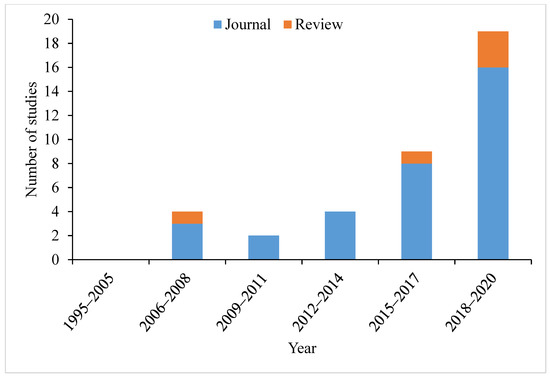 Using these terms, a total list of 38 (33 journals and five reviews) articles of molluscs that reported the impacts of either or both the active compound and a commercial formulation of neonicotinoids were reviewed. The results show an increasing trend in studies, with no study between 1995–2005 and the majority of the studies reported within the last five years (2015–2020) (Figure 2). While there are five review papers that mention neonicotinoids and molluscs, none to date have focused on molluscs and their responses to neonicotinoids. Previous reviews on the risks of neonicotinoids to a range of invertebrates, are dominated by studies on arthropods (e.g., [48,57]), but have concluded that molluscs are comparatively less sensitive to neonicotinoids.