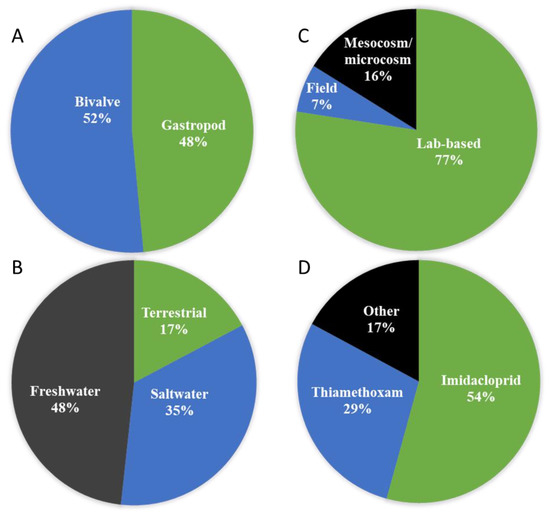 Figure 3. Summary of studies on the impacts of neonicotinoids on molluscs based on several factors: habitat type (A), study design (B), class of molluscs (C), and neonicotinoid type (D).