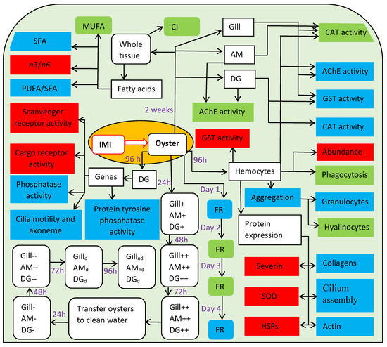 Figure 4. A conceptual network of the different parameters tested in a bivalve (oyster) after exposure to imidacloprid (IMI): Green = No effect; Red = Increase/elevation; Blue = Inhibition/Reduction; +, Absorbed; ++, Accumulated; -, Reduced concentration; --, Further reduction; d, Barely detected; nd, Not detected. SFA, Saturated fatty acid; PUFA, Polyunsaturated fatty acid; MUFA, Monounsaturated fatty acid; n-3, Omega 3 fatty acids; n-6, Omega 6 fatty acids; FR, Filtration rate; DG, Digestive gland; CI, Condition index; AChE, Acetylcholinesterase; CAT, Catalase; GST, Glutathione S-transferase; AM, Adductor muscle; HSPs, heat shock proteins; SOD, Extracellular superoxide dismutase. Source: Ewere [151].