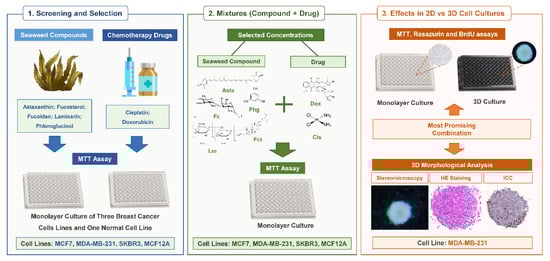 In view of the above, this study aimed to evaluate the cytotoxic activity of the seaweed bioactive compounds Asta, Fc, Fct, Lm, and Phg, alone or combined with Cis and Dox, in three BC cell lines and one non-tumorous breast line, in monolayer culture (2D). The most promising combination of seaweed compound plus drug in monolayer was chosen to be investigated as to viability and proliferation, using a comparative approach with two in vitro systems (2D-monolayers versus 3D–MCAs).