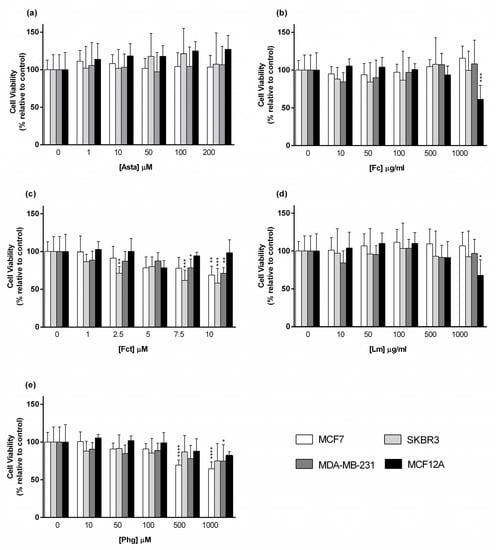 Cytotoxic effect of (a) Astaxanthin (Asta), (b) Fucoidan (Fc), (c) Fucosterol (Fct), (d) Laminarin (Lm), and (e) Phloroglucinol (Phg) assessed by MTT assay after 72 h of exposure in the panel of breast cell lines cultured in monolayer. Control corresponds to cells with medium containing 0.1% DMSO. The percentages of cell viability are relative to the controls and presented as mean + standard deviation of six independent experiments (each in triplicate). (* p < 0.05, ** p < 0.01, *** p < 0.001, **** p < 0.0001).