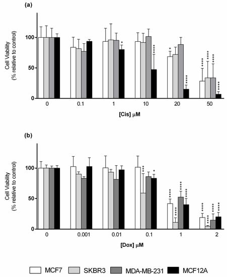 Considering Cis exposure (Figure 3a), the non-tumoral cell line (MCF12A) was the most susceptible to this drug, being the only cell line that showed a statistically significant reduction on cell viability when cells were exposed to Cis at 1 µM, inducing then a concentration-dependent response. In contrast, MCF7, only showed significant differences in cell viability at Cis (20 µM and 50 µM), while SKBR3 and MDA-MB-231 were still more refractive to Cis action, with a lowering trend at 20 µM that reached significance at 50 µM. At the latter concentration, all cell lines had their cell viability decreased below 50%, in relation to the control.