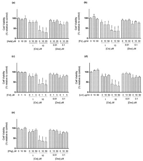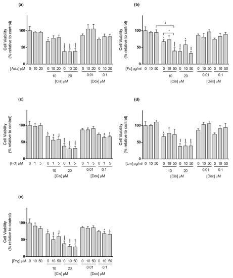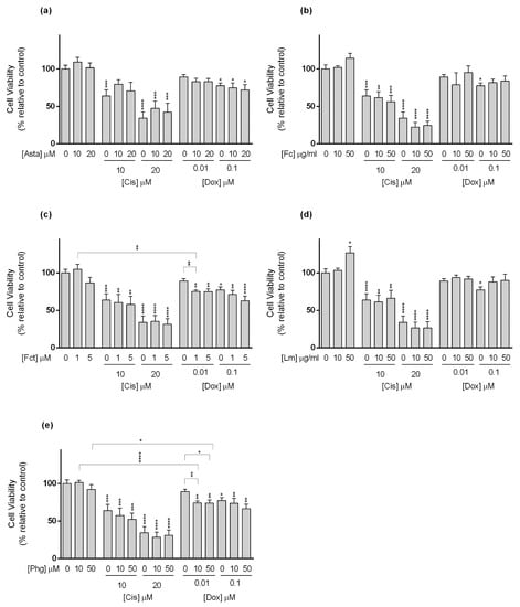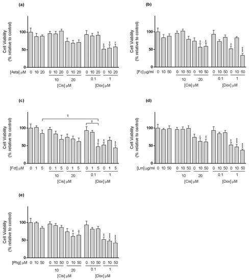 Regarding the SKBR3 line (Figure 5), Cis alone reduced cell viability at the tested concentrations. As to the combinations, the following conditions: Cis (10 µM) plus Asta (10 and 20 µM), Fc (10 µM), and Lm (10 and 50 µM), decreased the cytotoxicity of the drug not differing from the control. However, the combination Cis (10 µM) with Fc (50 µM) decreased cell viability to a percentage that statistically differed from the drug and Fc alone (Figure 5b). This combination enhanced the cytotoxic effect of Cis in ≈28%. Nonetheless, in the combination of Dox at 0.1 µM with Fct (1 and 5 µM), and Phg (10 and 50 µM), the cell viability differed from the control, not differing from the drug nor the compound alone (Figure 5c,e).
