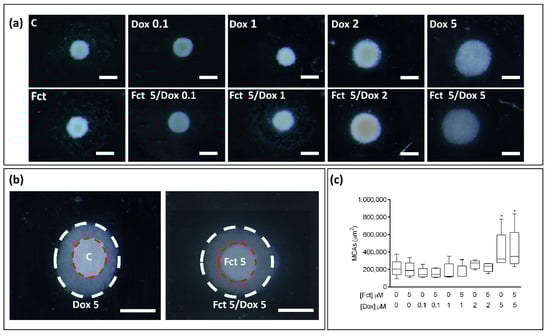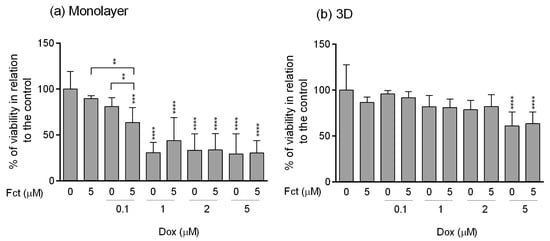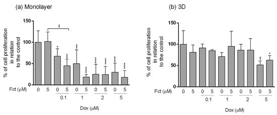 In relation to Dox, alone at 1 µM, it negatively affected cell viability. When combined with Fc (10 µg/mL) and Fct (1 µM), Dox at 1 µM seemed to have lost its action, while in combination with Fc (50 µg/mL) and Fct (5 µM) its effects were maintained (Figure 6b,c). The combination differing from control and with the most evident impact in cell viability, when compared to either to the compound or to the drug alone, was Dox (0.01 µM) with Fct (5 µM), which increased Dox cytotoxicity in ≈46%.