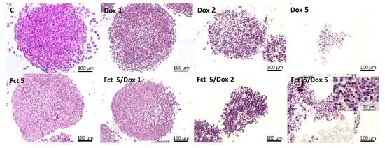 For comparison purposes, we selected the most promising combination in which the seaweed compound and the drug alone did not have any effect on cell viability in relation to the control, but the combination potentiated the effect of the drug, that is, differing from the control and from the compound and drug alone. The selected combination was Fct 5 µM with Dox 0.1 µM in MDA-MB-231 cell line, as it revealed the most evident effect on cell viability, showing, on average, 46% less cellular viability than the drug alone. This selected combination was tested simultaneously in monolayer and in 3D culture, the latter providing multicellular aggregates (MCAs). Considering that 3D cultures are commonly more resistant to treatments [,], we augmented the concentration of Dox (1, 2, and 5 µM) to allow the visualization of the drug effect and to have a concentration that served as a positive control (in this case Dox 5 µM). An all-new set of experiments was conducted, with new replicas, where cell viability was assessed by MTT and resazurin assays, and cell proliferation was evaluated by the BrdU assay. Additionally, MCAs were evaluated by performing area measurement, histological and immunocytochemical analysis.