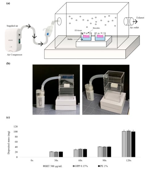 Aerosol exposure system and time course in the mass deposition of aerosolized biocides: (a) Schematic representation and (b) photo of aerosol application. Aerosol exposure occurs in the middle of the chamber. The tissue inserts are housed in a tissue tray prefilled with culture media during exposure. (c) The time course in the mass deposition of aerosolized biocides. Data show mean mass deposited during exposure time (mean ± SD, n = 4). Biocides at other concentrations also showed similar trends (data not shown).